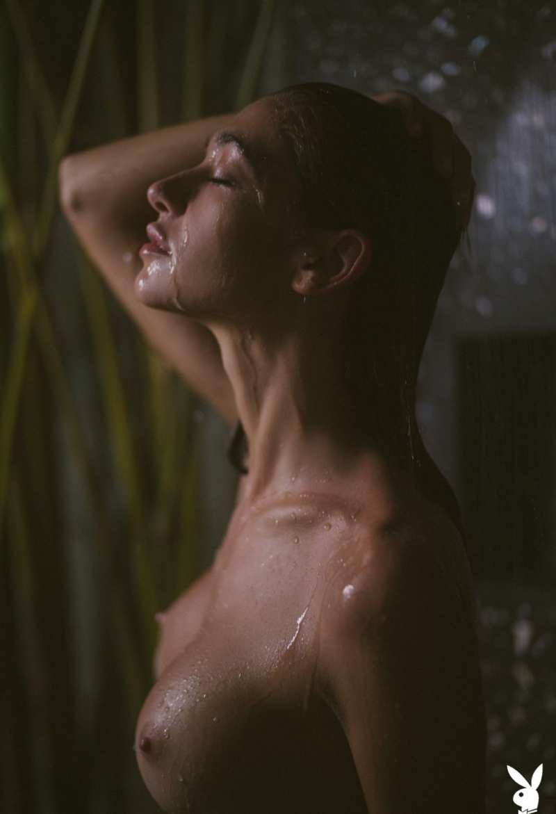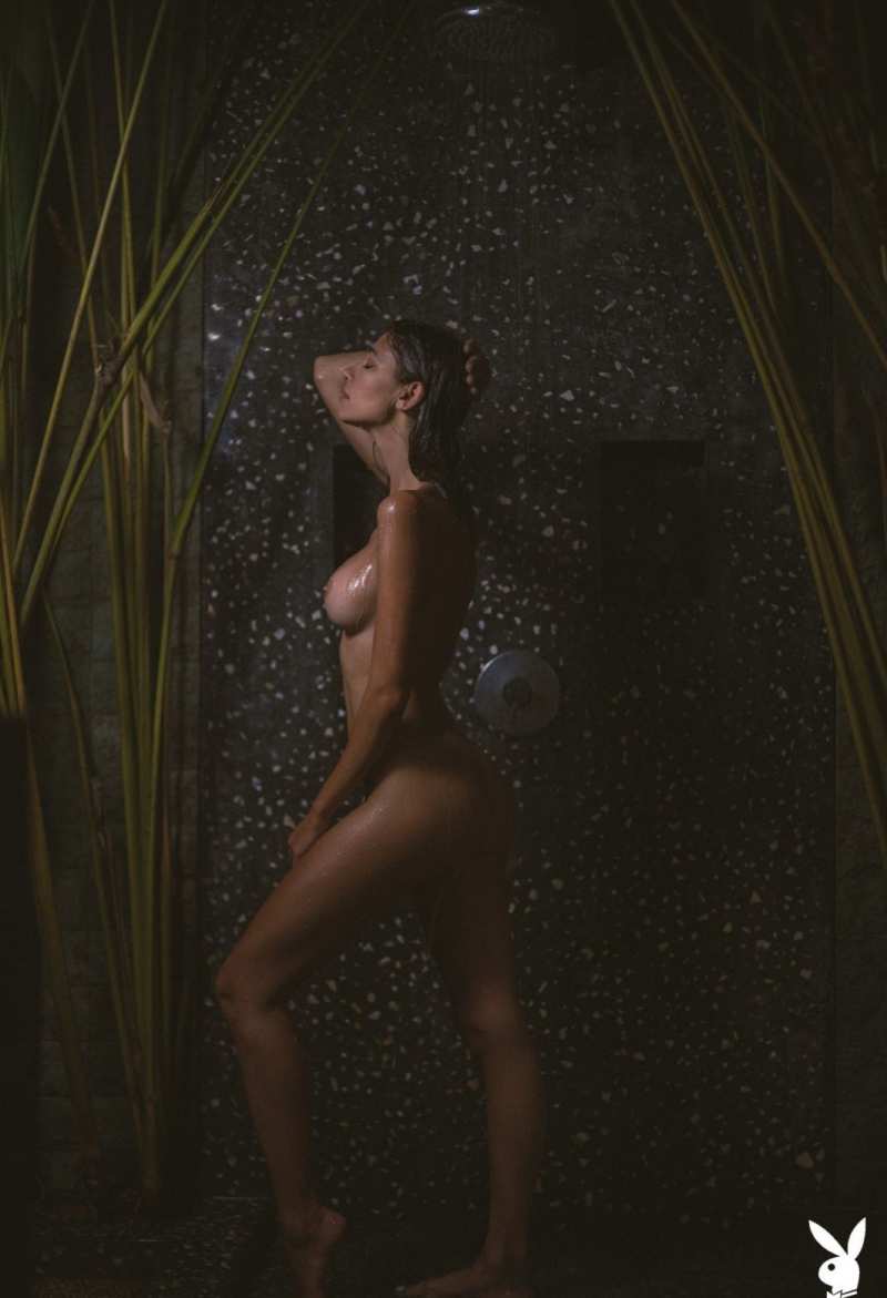 На вилле с фотографом журнала Плейбой гостьей оказалась обворожительная женщина с идеальным телом, которая решила провести фотосессию в стиле ню. Она позировала у бассейна, привлекая внимание своими сексуальными формами и снимая с себя всю лишнюю одежду. В процессе съемки, стройная красавица с напряженной грудью и торчащими сосками под действием воды, демонстрировала свою обнаженную прекрасную попку.