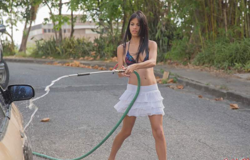 Одна горячая латинка с белоснежной улыбкой, в пикантном бикини, не только моет свою машину, но и манит своими изысканными формами. Ее тело переливается от лучей солнца, словно она сама стала частью лета. Она кокетливо обливает себя водой, дабы подчеркнуть свою красоту и соблазнить своим безупречным телом. Неудивительно, что парни не могут оторвать глаз от этой горячей крошки на капоте машины.