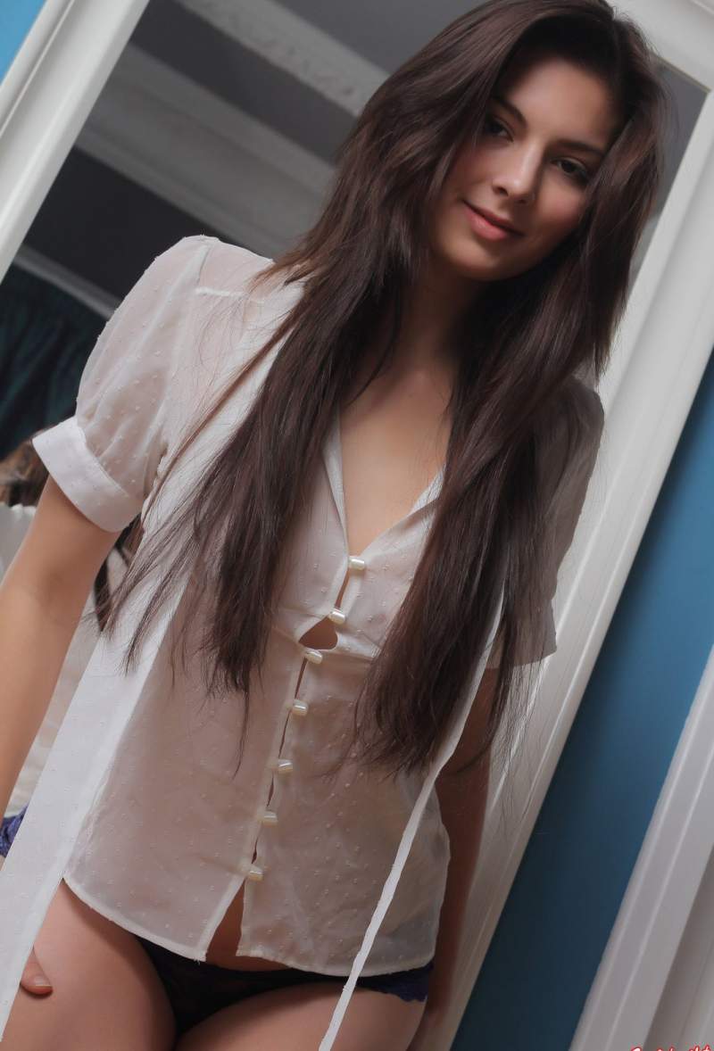 Брюнетка в полупрозрачных трусиках дразнит попкой