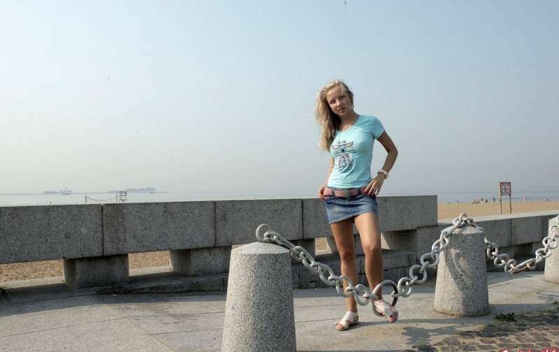 На фотографии изображена молодая и привлекательная девушка из России. Она одета в футболку и короткую джинсовую юбку. Прогулка происходит, вероятно, в парке «300-летия Санкт-Петербурга». В кадре можно увидеть, как девушка демонстрирует свои упругие молодые груди и гладко выбритую область бикини. В конце фотосессии молодая блондинка позирует, демонстрируя свою фигуру, уже на пляже.