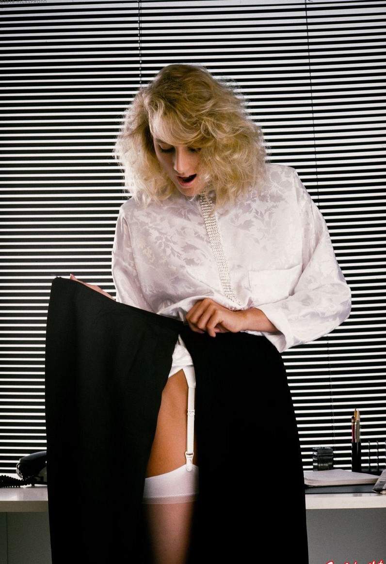 На фотографии запечатлена секретарша в офисе, сидящая за рабочим столом. Её ноги раздвинуты, а под юбкой нет нижнего белья, что позволяет увидеть её лобковые волосы. Образ женщины дополняют белоснежные чулки с подтяжками и туфли. На предпоследнем снимке она изображена в позе "раком".