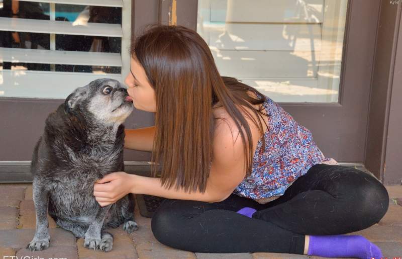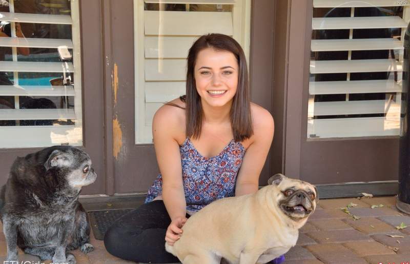 Горячая красотка целует мопсов и ласкает себя