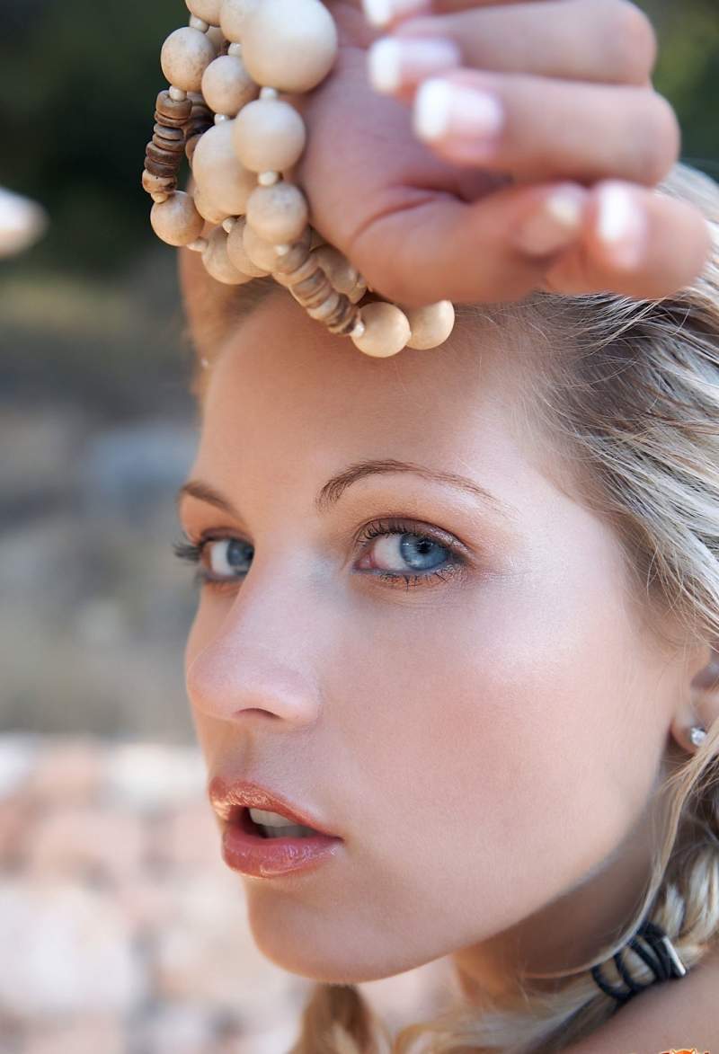 Красивая блондинка с голубыми глазами и классной фигурой сидит на лавочке и позирует перед камерой. Она явно хочет показать свои классные сиськи. Во время съёмки она часто показывает их крупным планом, а также свои упругие груди с красивыми сосками и аккуратно выбритую зону бикини.